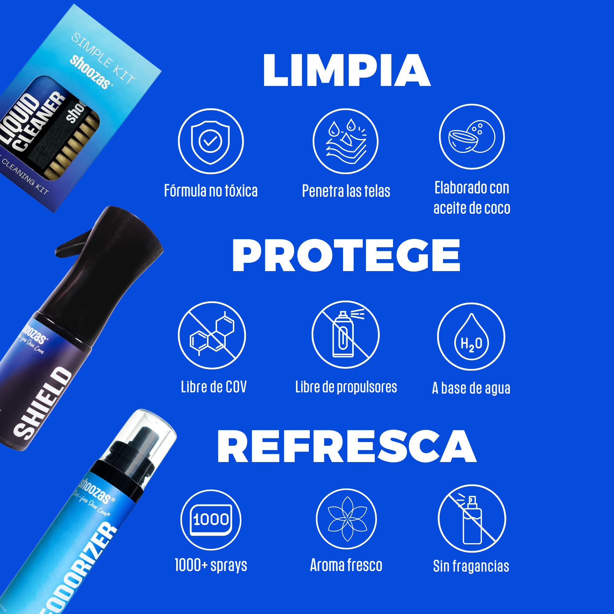 Limpia, protege, y refresca tus tenis con este combo. Limpia en profundidad, mantén tus tenis protegidos del agua y las manchas, y elimina los olores del uso diario.