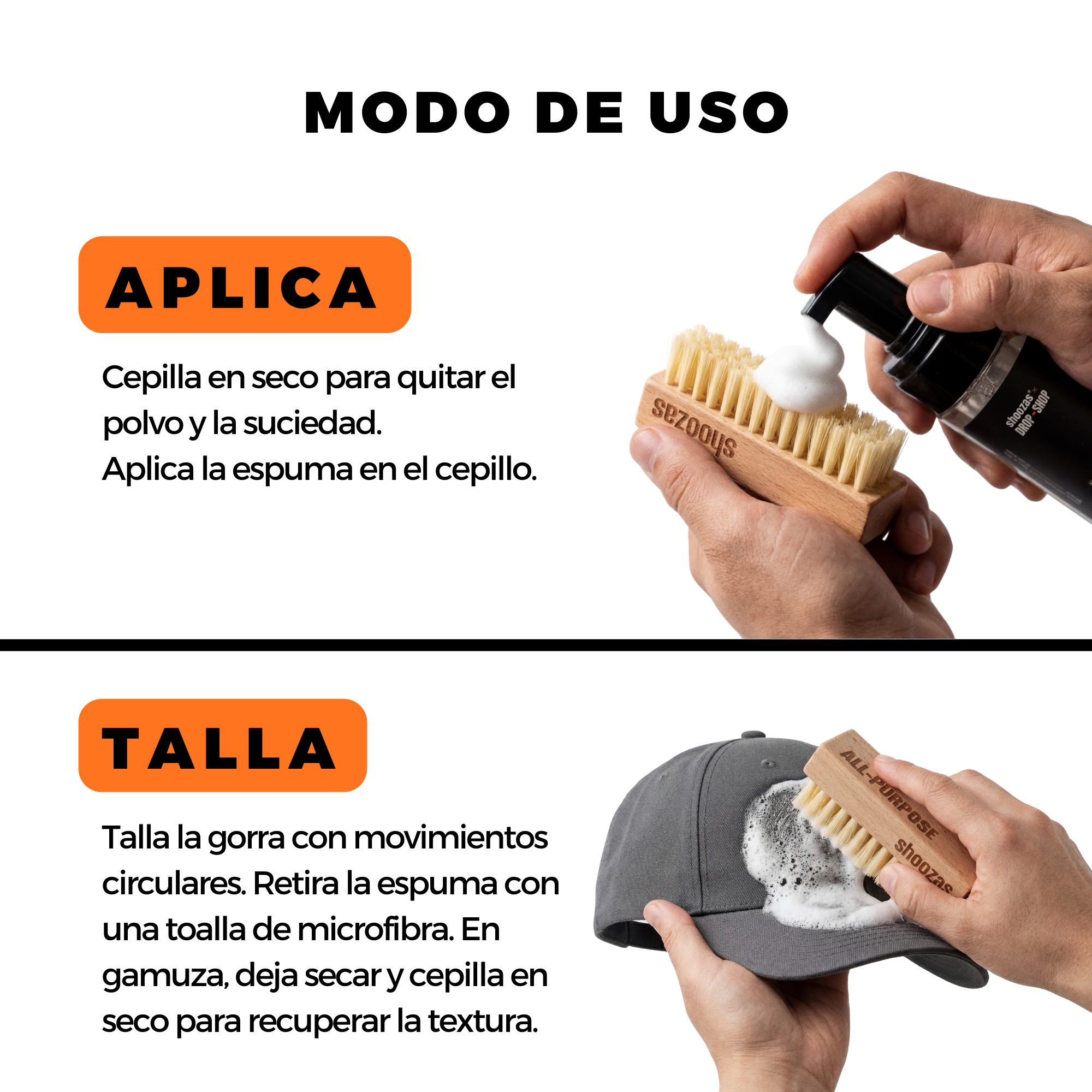 Nuestro limpiador de espuma no necesita agua. ¡Simplemente aplícalo directamente sobre tus gorras y comienza a limpiar!